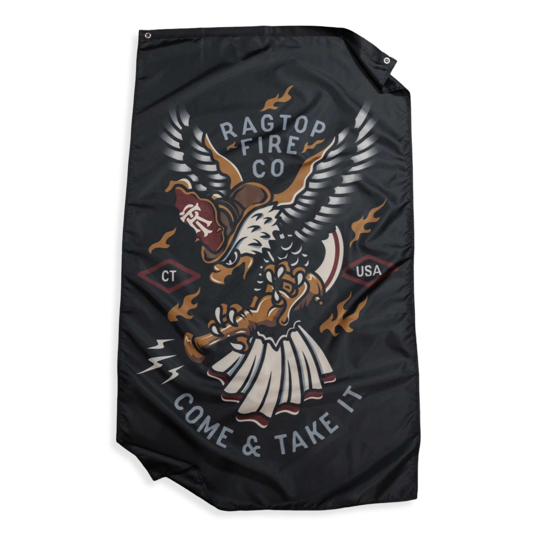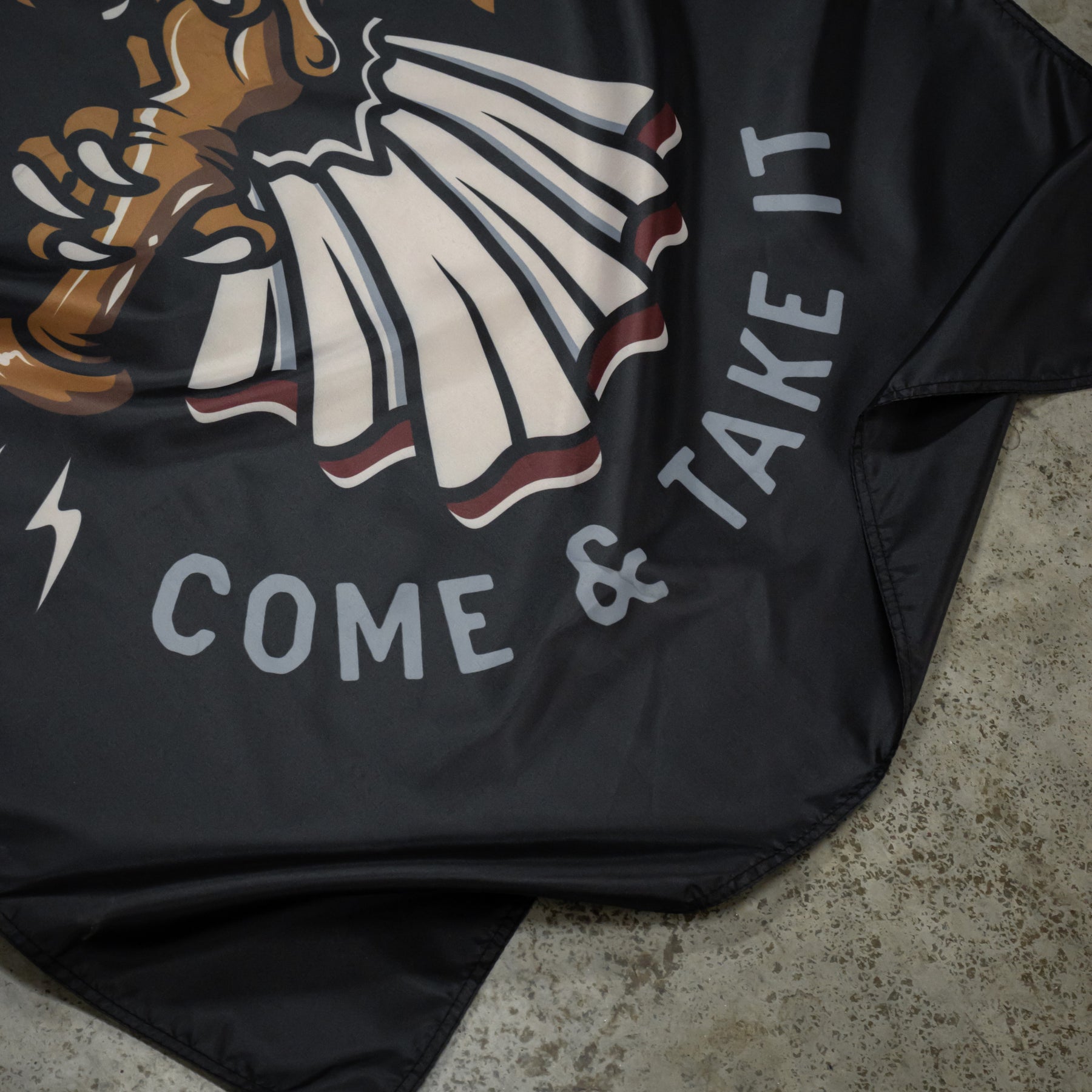 Our Come & Take It design printed on a 3' x 5' polyester flag. Perfect to hang up in the firehouse, bar, or in the man-cave.