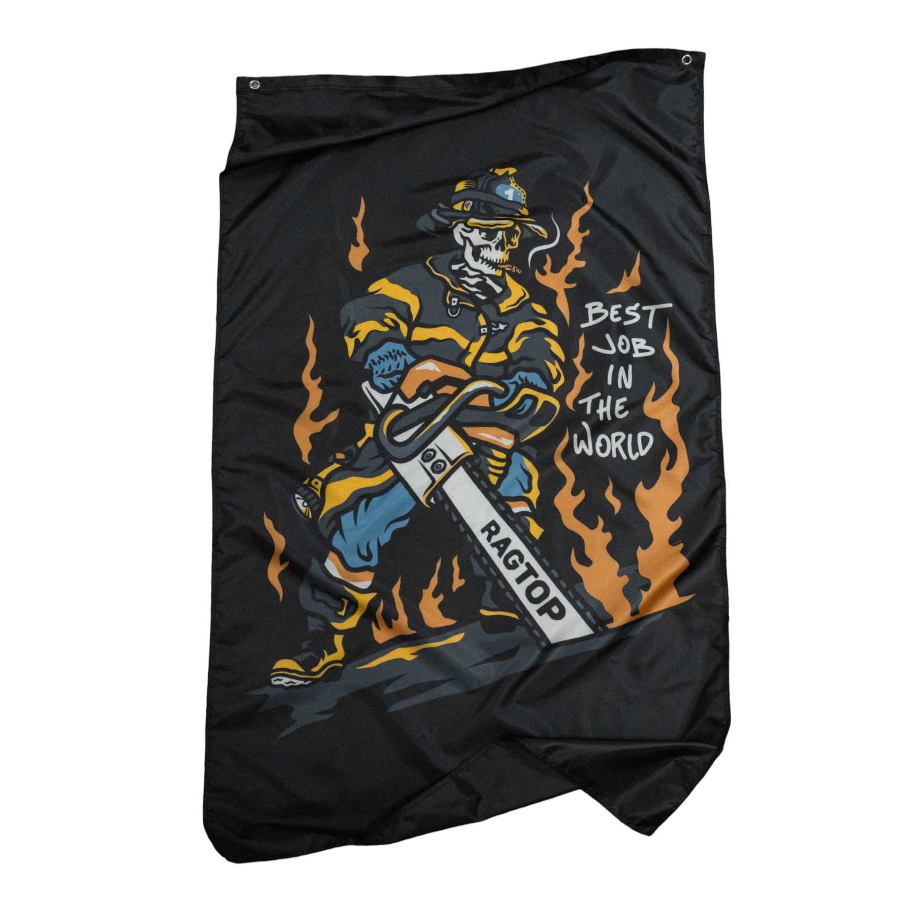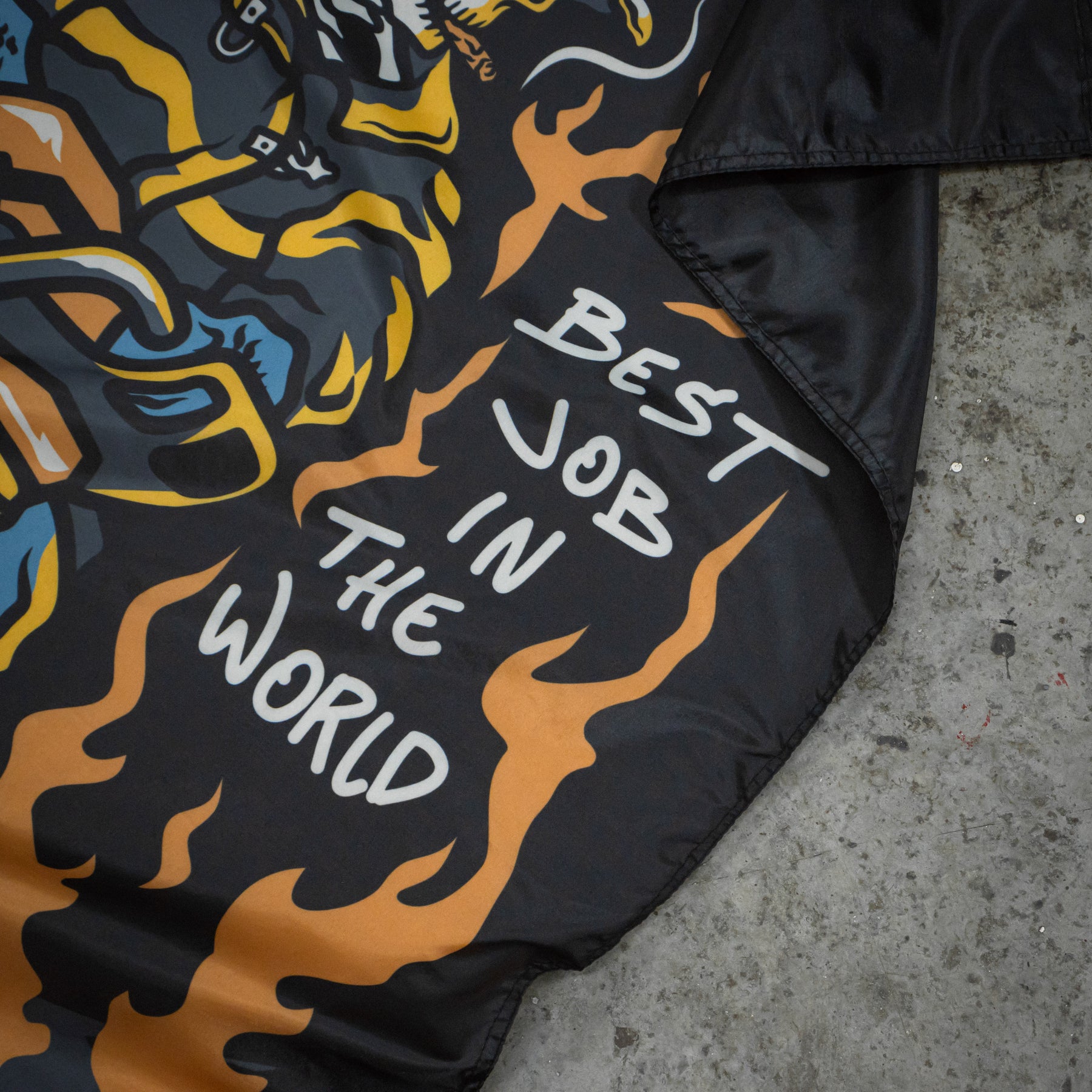 Our Best Job In The World design printed on a 3' x 5' polyester flag. Perfect to hang up in the firehouse, bar, or in the man-cave.